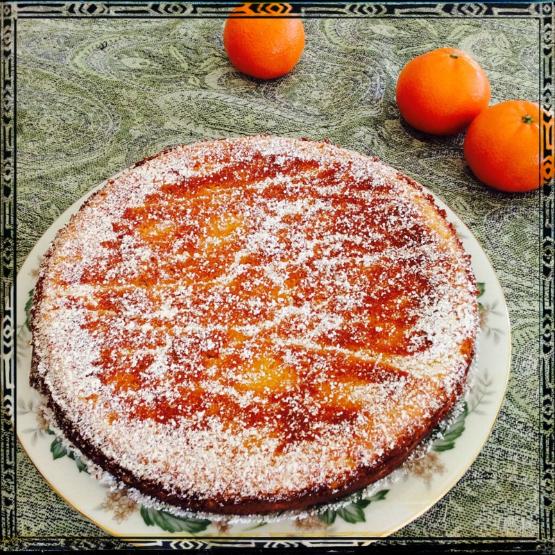 • When cool, I invert onto a plate, leaving it bottom-up. Dust with confectioners sugar and garnish with a twist of peel or two from another tangerine.
