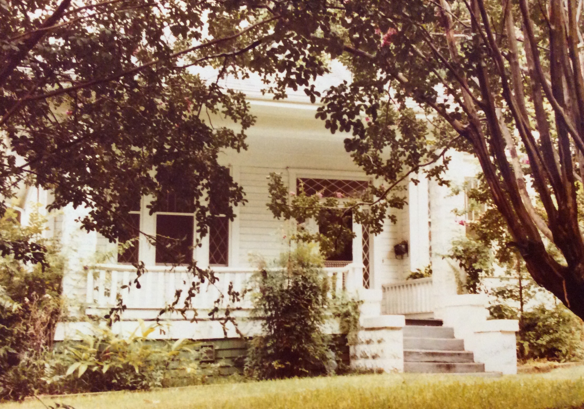 It had a very large, treed front lawn… which sloped steeply toward the house, resulting in ankle-deep water and mud in our carport every time it rained. It rained continually that spring! All of that rain made the tangle of vines covering our roof flower continuously, and there were bees buzzing everywhere! As the vines grew, they crept in foundation cracks, window trim, and through the eaves, in their attempt to reclaim the small cottage. We never needed curtains for privacy.