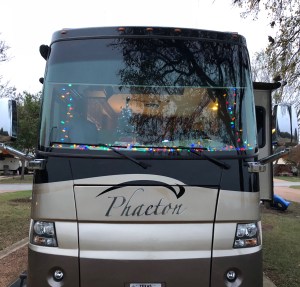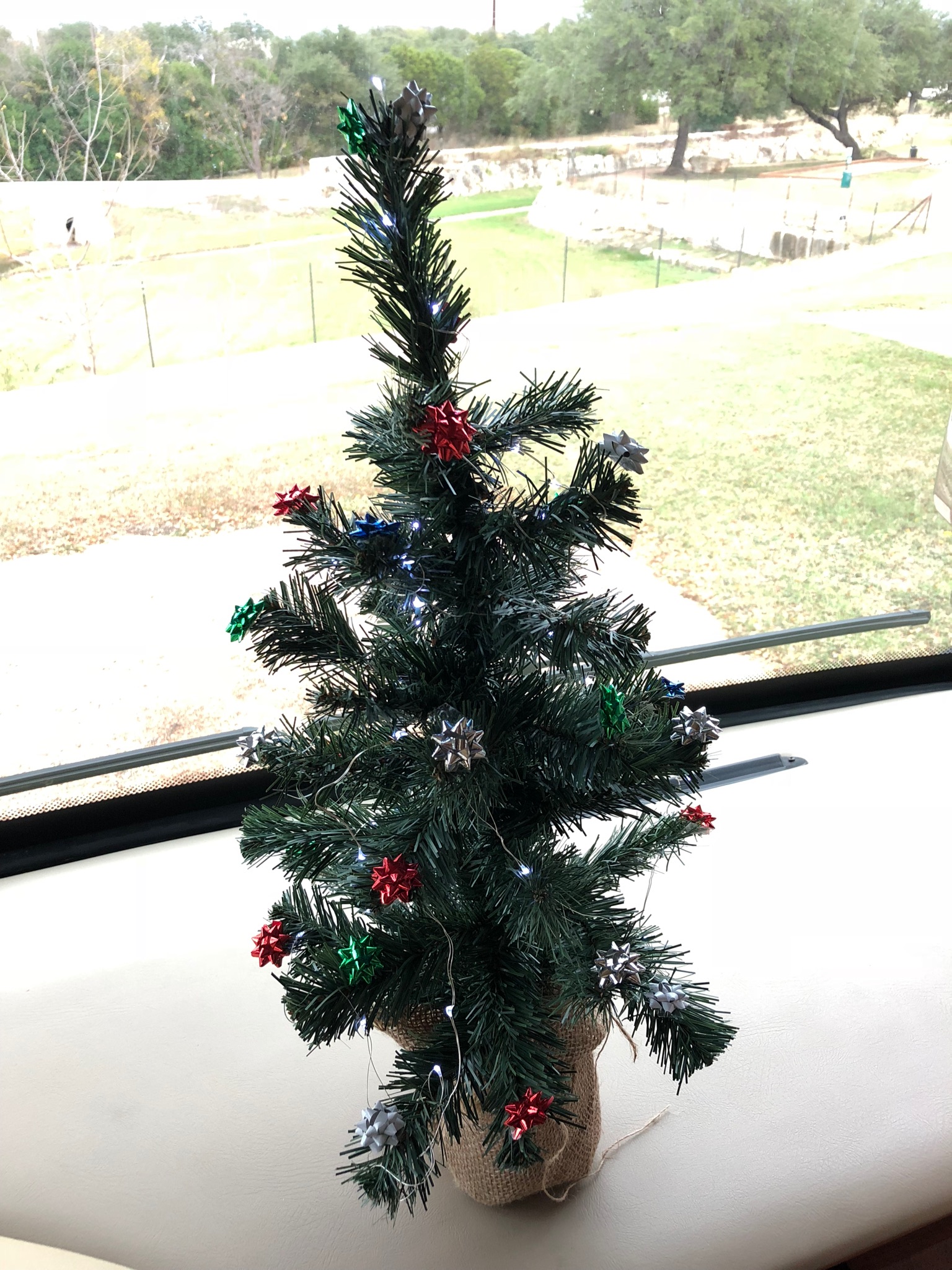 I am now out of the mood to try and finagle a way to hang holiday lights in here, so I ask for some help and we settle for arranging them on the dash, where after all of this effort, only the few people on the walking trail will ever see them. But we will see them, and you will too. My tiny Christmas tree does make the place merry and bright!