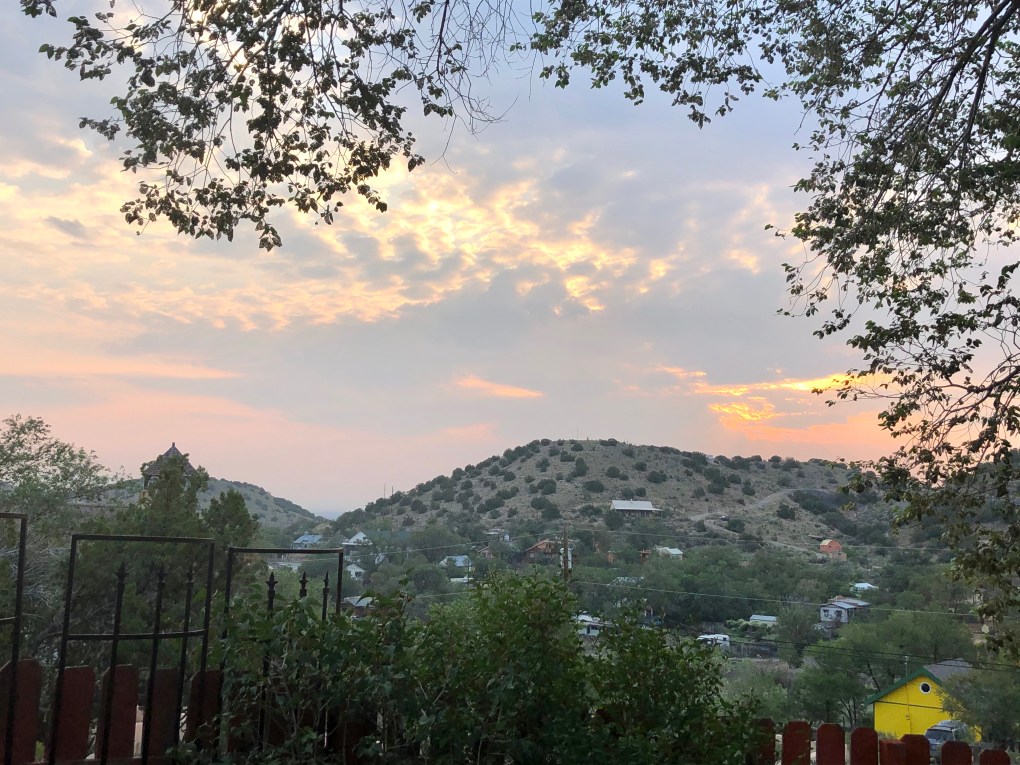 It was time to head into town to check-in to our AirBnB rooms. Our suite was in a small complex built in an up-and-coming area, upstairs above lovely gardens and a restaurant. We planned to relax, stroll the Plaza, and go to the O’Keeffe Museum, but so much was closed. A bit disquieting, in and of itself, but there was also a large fire burning up on the mountain, which was making it very smoky and very hard to breathe. We walked to breakfast twice, very early while it was still cool, bunnies scurrying into the brush as we approached. We stayed in our rooms each afternoon out of the heat and smoke. Evenings we’d spend on our porch or down in the café gardens. I could live in this place!