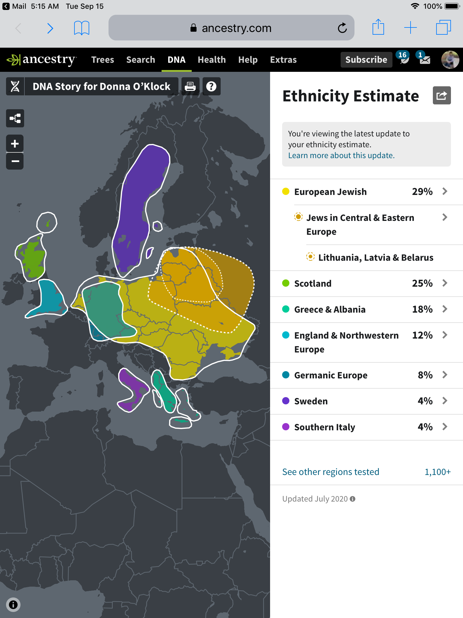 The more people explore their ancestry, the bigger the data base of DNA becomes and the more accurately results can be pinpointed. My map is an updated result for this year, and my Jewishness got “upgraded” three percent, which seemed somehow inevitable. I wanted to convert in high school – envious of my girlfriend’s Bat Mitzvahs (and nose-jobs) but my Father refused. And years later there was an almost-wedding and almost-conversion for Robby Cohen… who turned out not to be the “nice boy” I thought he was!