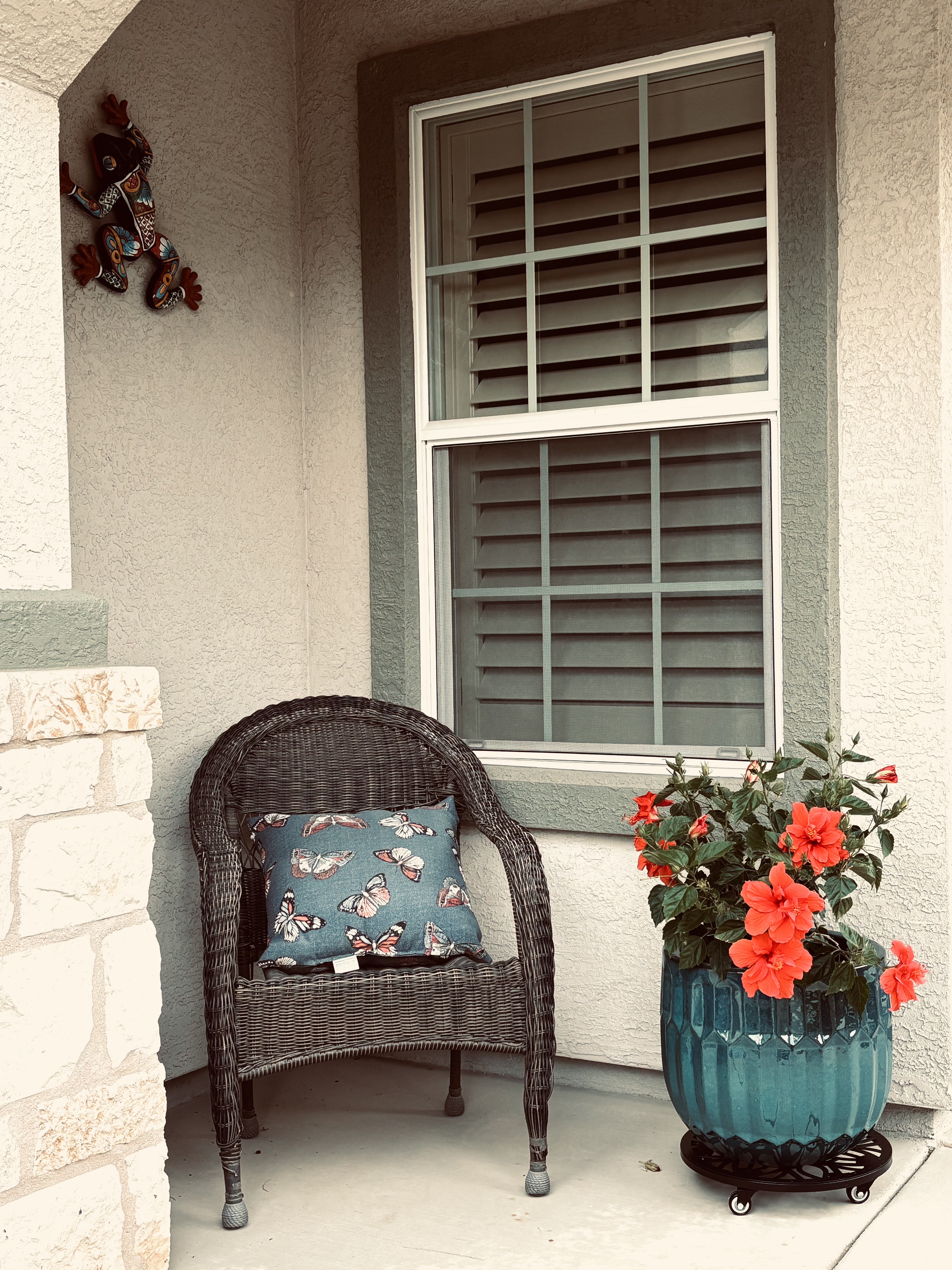 In between all the calls, and waiting for return calls, I decided that our entryway needed some sprucing up, something we’ve talked about for years. When we were in Costco they had beautiful ceramic pots on sale. Front porch worthy pots. We hauled one home, then went to the garden center and bought a Hibiscus that should thrive in the bright morning sun and indirect afternoon light. Her tag says she’s a Cecilia Hibiscus, with red double blooms. So, she came with her own name… and now when I water her I can’t help but sing the Simon and Garfunkle lyrics; “Cecilia, you’re breaking my heart, you’re shaking my confidence daily…oh Cecilia, I’m down on my knees, I’m begging you please to come home, come on home.” She seems at home in her new space, don’t you think?